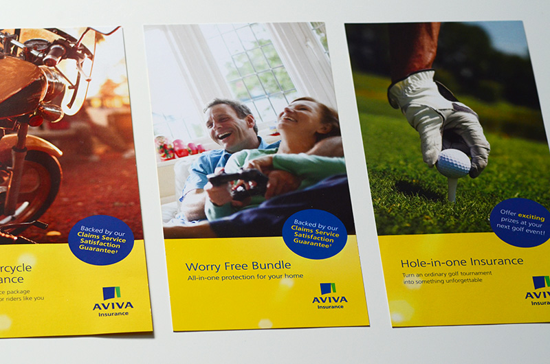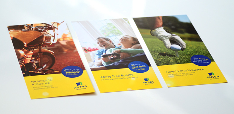 A diverse collection of print materials developed for Aviva, including brochures, product guides, microsites, buckslips, and other branded assets—designed to support customer communications and promote key insurance offerings across various channels.